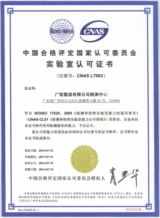 發(fā)稿時(shí)間:2014-07-24廣鋁集團有限公司檢測中心符合ISO/IEC 17025:2005《檢測和校準實(shí)驗室能力的通用要求》(CNAS-CL01《檢測和校準實(shí)驗室能力認可準則》)的要求,于2014年7月15日(7月22日獲得證書(shū))正式通過(guò)中國合格評定國家認可委員會(huì )(CNAS)的認可資格,具備承擔證書(shū)附件所列檢測服務(wù)的能力。我司檢測中心可在認證認可的范圍內使用CNAS國家實(shí)驗室認可標志,同時(shí)“廣鋁集團有限公司檢測中心”將列入中國合格評定國家認可委員會(huì )的獲準認證認可機構名錄,在CNAS官方網(wǎng)站電子注冊、發(fā)布,接受認證認可機構的監督審核,將大幅提高公司的知名度,增強公司在同行業(yè)中的市場(chǎng)競爭能力,為我司的長(cháng)期發(fā)展奠定堅實(shí)的基礎。