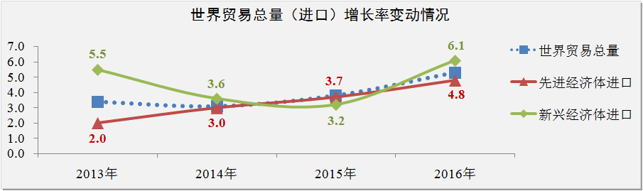 IMF數據顯示,2015-2016年世界貿易總量(貨物和服務(wù))將會(huì )出現較快增長(cháng)趨勢,增長(cháng)率分別為3.8%和5.3%。受石油價(jià)格及大宗商品價(jià)格下跌對貿易條件和實(shí)際收入的負面影響,預計2015年新興經(jīng)濟體對世界貿易增長(cháng)的貢獻將低于先進(jìn)經(jīng)濟體,增長(cháng)率為3.2%。隨著(zhù)負面影響逐步化解,預計2016年新興經(jīng)濟體的貿易增長(cháng)率將快速回升至6.1%。