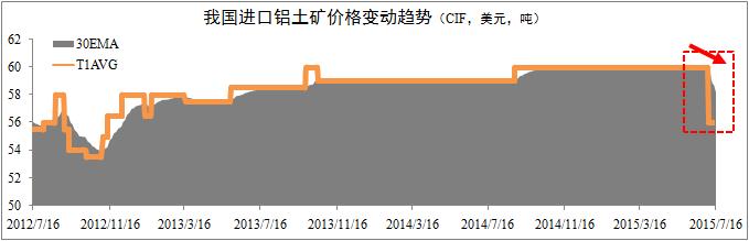 進(jìn)口礦出現區間跳水現象。市場(chǎng)監控數據顯示,自今年7月6日以來(lái),我國進(jìn)口鋁土礦到岸價(jià)(CIF)出現異常波動(dòng)情況,CIF價(jià)格出現區間跳水現象。截至7月16日,我國進(jìn)口鋁土礦30天移動(dòng)平均價(jià)格(30EMA)已由60美元下跌至58美元,日均價(jià)格(T1AVG)下跌至56美元,區間降幅達7.1%。