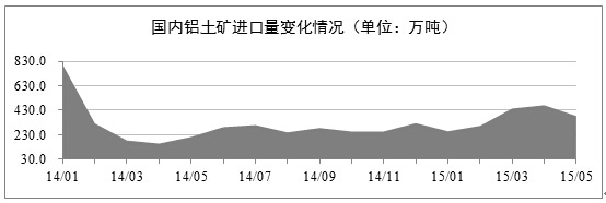 進(jìn)口鋁土礦量下降。2015年5月份的鋁土礦進(jìn)口量依舊保持在較高的水平,但相比前兩個(gè)月的數據已經(jīng)出現了較大幅度的下降。海關(guān)數據顯示,2015年5月份我國的鋁土礦進(jìn)口量為383.2萬(wàn)噸,環(huán)比降低了18.80%,同比增長(cháng)了80.5%。當期,澳大利亞、印度和馬來(lái)西亞為主要的進(jìn)口國,其進(jìn)口占比高達93.4%。
