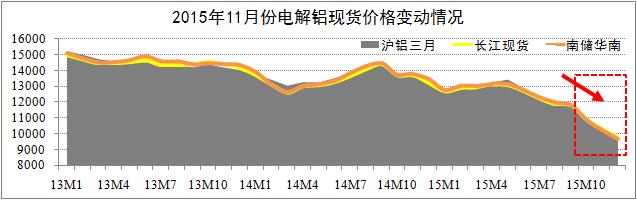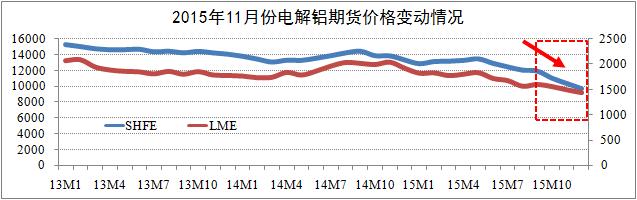 期貨市場(chǎng)方面:截至11月24日,滬鋁三月結算跌至9670元,自跌破萬(wàn)元大關(guān)以來(lái),滬鋁主力合約日均漲跌幅為1.4%-2.1%;LME鋁三月結算跌至1446美元,其跌幅自今年8月以來(lái)開(kāi)始低于滬鋁跌幅。研究認為,滬鋁三月與LME鋁三月結算價(jià)將逐步筑底于9600元關(guān)口(Min.值),期鋁價(jià)格將迎來(lái)較大的反彈空間。