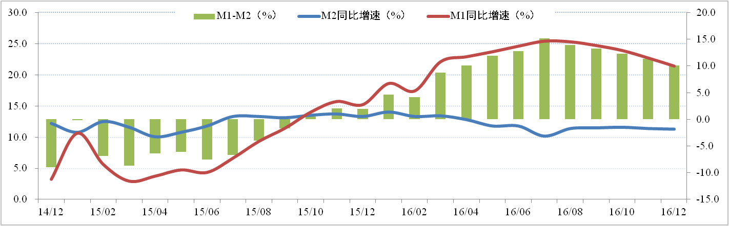 據央行數據統計顯示,中國12月M2貨幣供應同比增速為11.3%,環(huán)比回落0.1個(gè)百分點(diǎn);M1貨幣供應同比增速為21.4%,環(huán)比回落1.3個(gè)百分點(diǎn)。 M1與M2剪刀差進(jìn)一步縮小為10.1%。