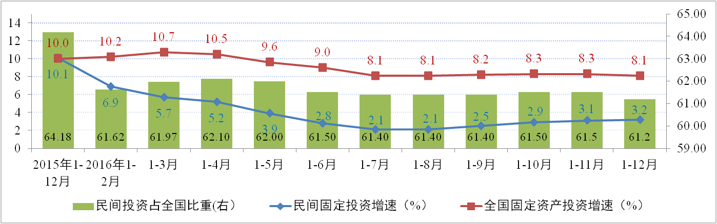 據國家統計局統計數據顯示,2016年1-12月,全國固定資產(chǎn)投資同比名義增長(cháng)8.1%,環(huán)比回落0.2個(gè)百分點(diǎn)。民間固定資產(chǎn)投資同比名義增長(cháng)3.2%,環(huán)比上升0.1個(gè)百分點(diǎn)。民間固定資產(chǎn)投資占全國固定資產(chǎn)投資(不含農戶(hù))的比重為61.2%,環(huán)比下降0.3個(gè)百分點(diǎn)。