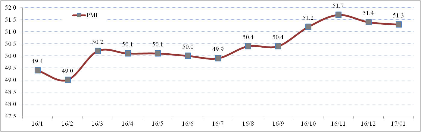國家統計局數據顯示,2017年1月份,中國制造業(yè)采購經(jīng)理指數(PMI)為51.3%,比上月微落0.1個(gè)百分點(diǎn),連續6個(gè)月站上50%的榮枯線(xiàn),延續平穩擴張態(tài)勢。其中,生產(chǎn)指數和新訂單指數分別為53.1%和52.8%,分別較上月回落0.2和0.4個(gè)百分點(diǎn)??偟膩?lái)看,反映供需變化的生產(chǎn)和新訂單指數,延續去年四季度以來(lái)向好態(tài)勢,說(shuō)明當前供需基本面良好,增長(cháng)態(tài)勢均衡。