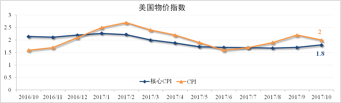 10月美國CPI為2%,較上月下滑0.2個(gè)百分點(diǎn),復合市場(chǎng)預期,主要原因是颶風(fēng)影響的能源供給恢復從而導致能源價(jià)格下跌。剔除能源項的核心CPI終結了連續4個(gè)月的持平,較上月擴大0.1個(gè)百分點(diǎn)報1.8%,超出市場(chǎng)預期。