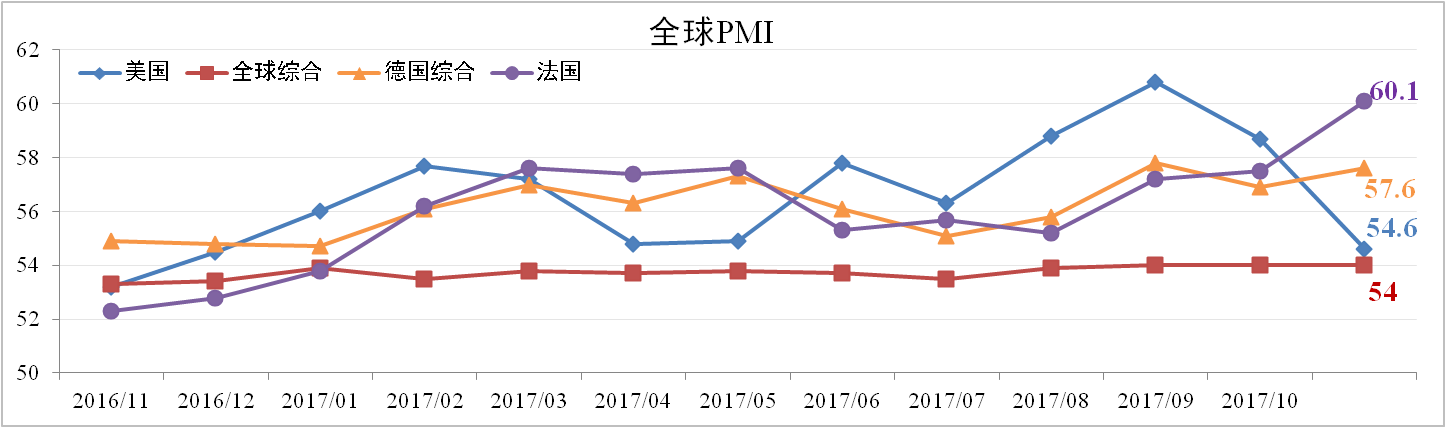 據市場(chǎng)調查機構IHS Markit數據顯示,11月全球綜合PMI為54,持平于上月。發(fā)達國家表現有所分化,其中美國綜合PMI下滑至54.6,德國、法國綜合PMI則分別上揚至57.6、60.1。