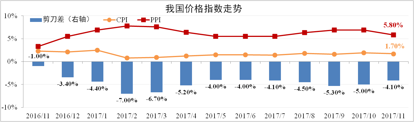 11月我國CPI為1.7%,較10月收縮0.2個(gè)百分點(diǎn),不及市場(chǎng)預期。PPI為5.8%,較上月大幅下滑1.1個(gè)百分點(diǎn)。剪刀差從-5.0%收窄至-4.1%。