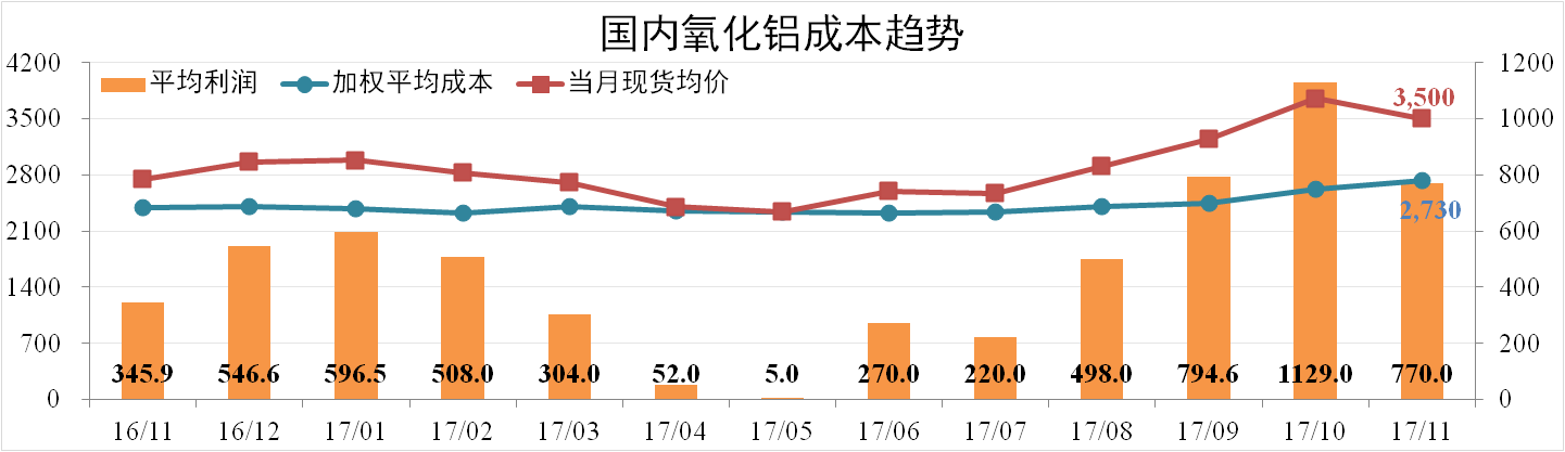 11月份國內氧化鋁加權平均成本為2,730元/噸,環(huán)比上漲4.16個(gè)百分點(diǎn)。當月全國氧化鋁現貨成交均價(jià)為3,500元/噸,較上月下跌5.56%。理論上,氧化鋁行業(yè)平均利潤水平為770/噸。