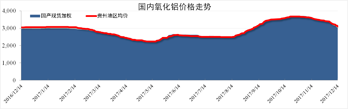 截至12月14日,國產(chǎn)氧化鋁現貨加權均價(jià)為3,000元/噸,同比上漲0.9%,環(huán)比下跌16.78%。貴州地區氧化鋁現貨加權均價(jià)為3,300元/噸,同比上漲1.3%,環(huán)比下跌13.41個(gè)百分點(diǎn)。