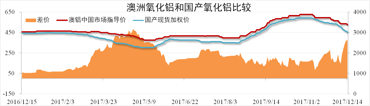 11月份國產(chǎn)氧化鋁價(jià)格略有下降,進(jìn)口氧化鋁價(jià)格隨之下降。截至12月14日,國產(chǎn)氧化鋁現貨加權價(jià)格為3,000元/噸,環(huán)比下降15.85%。澳鋁中國市場(chǎng)指導價(jià)為3, 375元/噸,環(huán)比下降9.40%,二者價(jià)差達375元/噸。