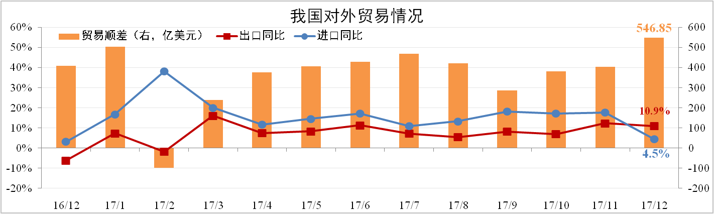 分析認為:內需轉弱導致原材料進(jìn)口量大幅下降致使進(jìn)口增速大幅下滑。美國頻繁挑起貿易摩擦會(huì )對我國2018年出口造成影響,而國內經(jīng)濟增速趨緩致使進(jìn)口增速也面臨回調壓力。預計2018年進(jìn)出口雙雙回落。
