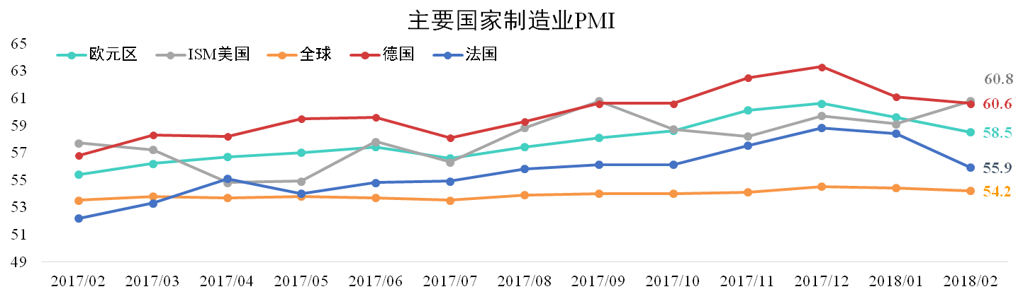 全球經(jīng)濟景氣程度有所放緩,且發(fā)達國家之間出現分化。2月份全球制造業(yè)PMI為54.2,較上月下滑0.2點(diǎn)。歐洲國家PMI普遍下滑,但仍處于擴張區間,美國ISM制造業(yè)PMI為60.8,較上月大幅擴大2.4點(diǎn)。