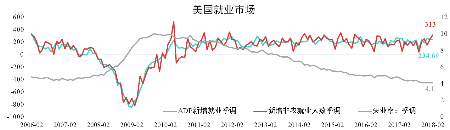 美國就業(yè)市場(chǎng)表現強勁。2月份美國新增非農就業(yè)人數31.3萬(wàn)人,大幅超出市場(chǎng)預期;失業(yè)率連續5個(gè)月維持在4.1%,接近充分就業(yè)水平;時(shí)薪增速2.6%,較上月小幅回落0.3個(gè)百分點(diǎn)。
