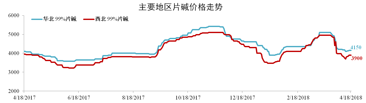 3月受市場(chǎng)供需基本面主導,片堿價(jià)格沖高后回落。截止2018年4月18日,華北99%片堿價(jià)格報4150元/噸,環(huán)比下跌18.63%,西北99%片堿價(jià)格報3900元/噸,環(huán)比下跌21.21%。