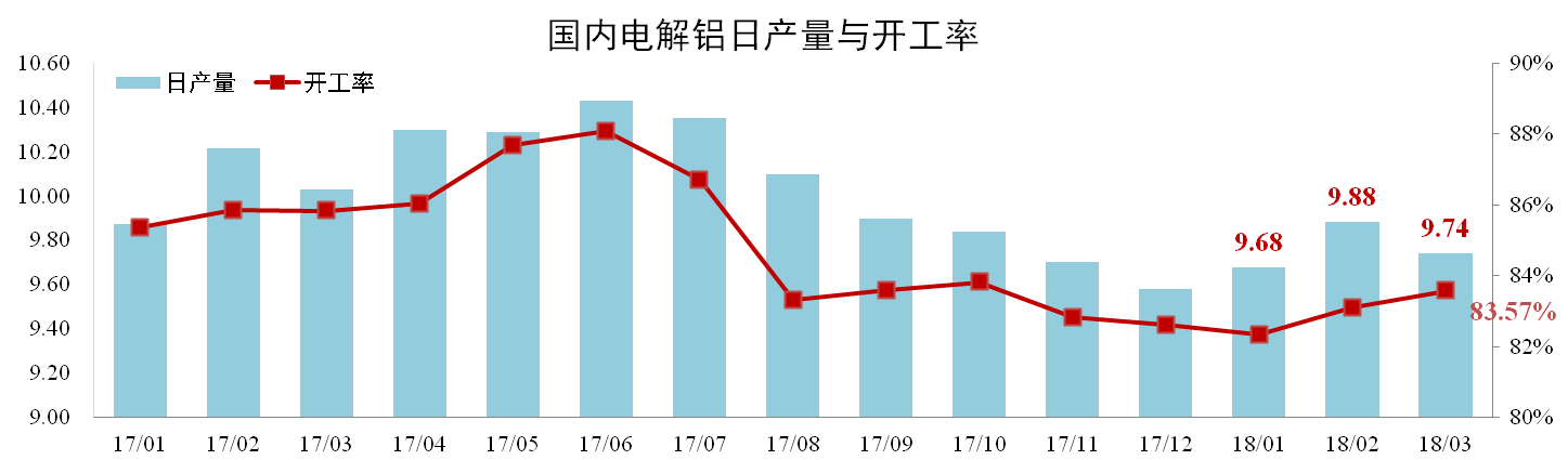 3月份中國電解鋁總產(chǎn)能4359.8萬(wàn)噸,運行產(chǎn)能3643.7萬(wàn)噸,開(kāi)工率83.57%,日產(chǎn)量9.74萬(wàn)噸,環(huán)比下降1.42%。截至4月19日,2018年國內新產(chǎn)能已投產(chǎn)46.3萬(wàn)噸,待開(kāi)工269.95萬(wàn)噸,年內在建且可投產(chǎn)新產(chǎn)能395.75萬(wàn)噸。