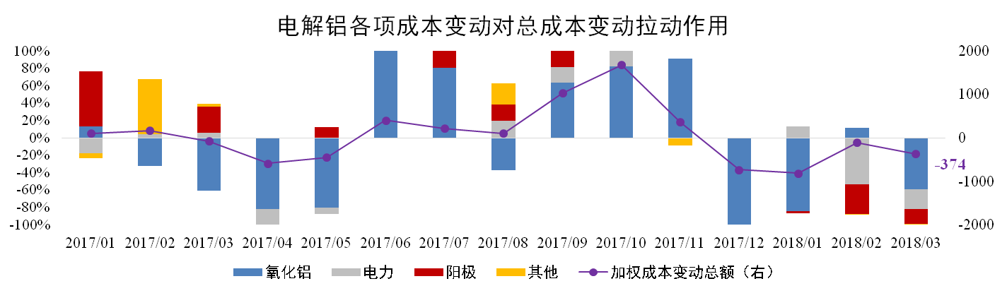 分析認為:3月氧化鋁價(jià)格受基本面及政策主導價(jià)格下降,煤炭供應寬松,煤企主動(dòng)下調價(jià)格致使電力成本繼續下跌,陽(yáng)極復產(chǎn)加快供應過(guò)剩拖累價(jià)格進(jìn)一步下滑,預計電解鋁成本仍將延續下降趨勢。