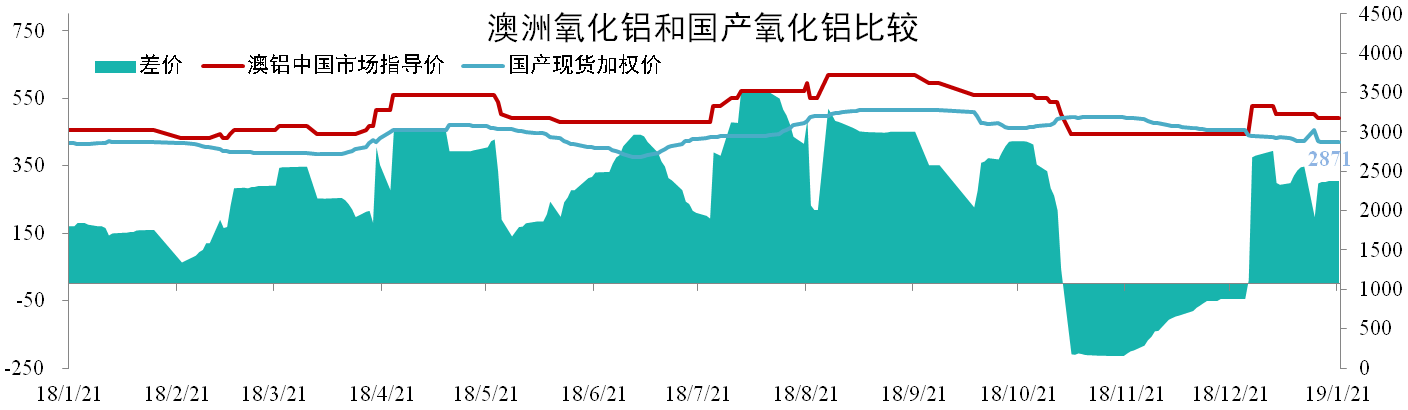 截至1月21日,國產(chǎn)氧化鋁現貨加權均價(jià)為2871元/噸,環(huán)比下降4.92%。澳鋁中國市場(chǎng)指導價(jià)為3175元/噸,同比上漲4.96%,國產(chǎn)氧化鋁價(jià)格較澳鋁指導價(jià)低304元/噸。