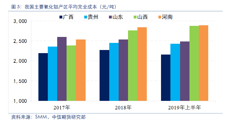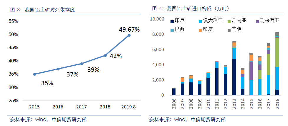 海關(guān)數據顯示,2014年以來(lái),我國鋁土礦進(jìn)口保持穩步增長(cháng)。2018年,我國氧化鋁產(chǎn)量約為7200萬(wàn)噸,鋁土礦產(chǎn)量約1億噸,2018年全國進(jìn)口鋁土礦約占國內礦石總供應量的42%。海外礦石因儲量豐富、開(kāi)采成本低、礦石品位較高等優(yōu)勢逐漸受到國內氧化鋁企業(yè)的青睞,另外,隨著(zhù)山西地區資源過(guò)度開(kāi)采,鋁土礦品位下降,山西政府有保護省內資源的意愿,預計該地區礦石開(kāi)采將繼續受到限制,進(jìn)口礦使用將逐漸成為主流。